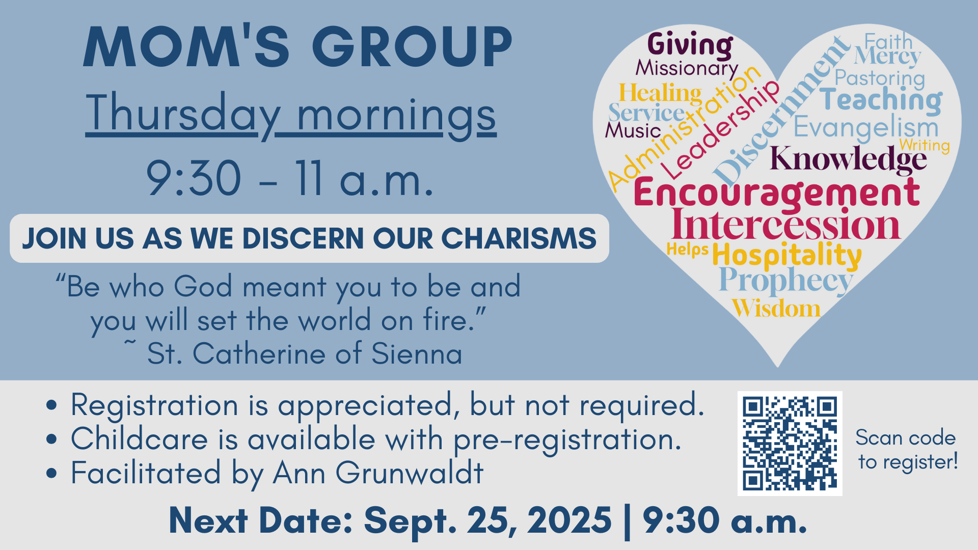 Mom's Group is a time for moms to come together for community building, faith sharing, and hospitality. Meetings are facilitated by Ann Grunwaldt. Childcare is offered with preregistration.