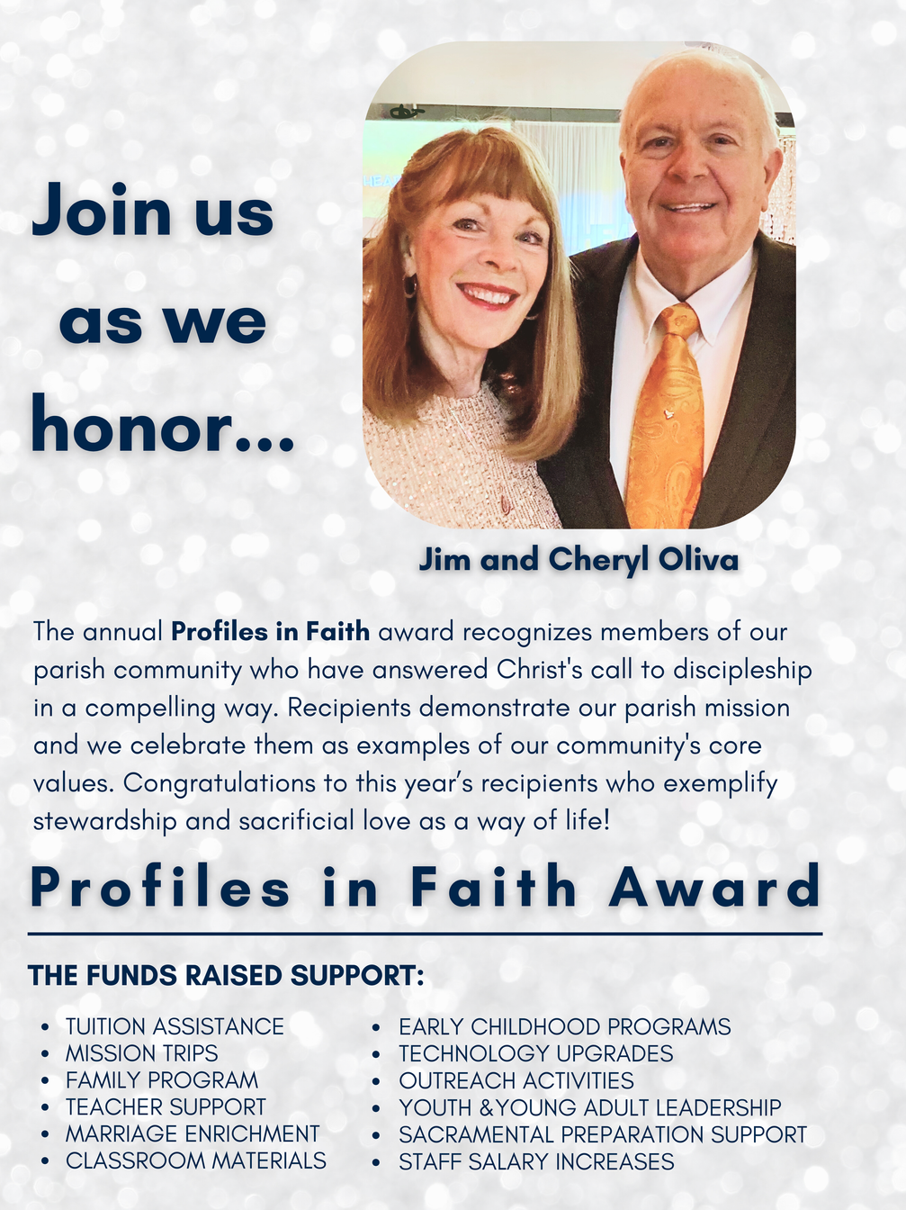 The purpose of the event is to come together as a faith family -- our Catholic parish, school and lifelong faith formation programs -- to raise crucial funds to keep St. Anthony on the Lake thriving and moving forward. We will also honor our Profiles in Faith award winners, parishioners Jim and Cheryl Oliva.