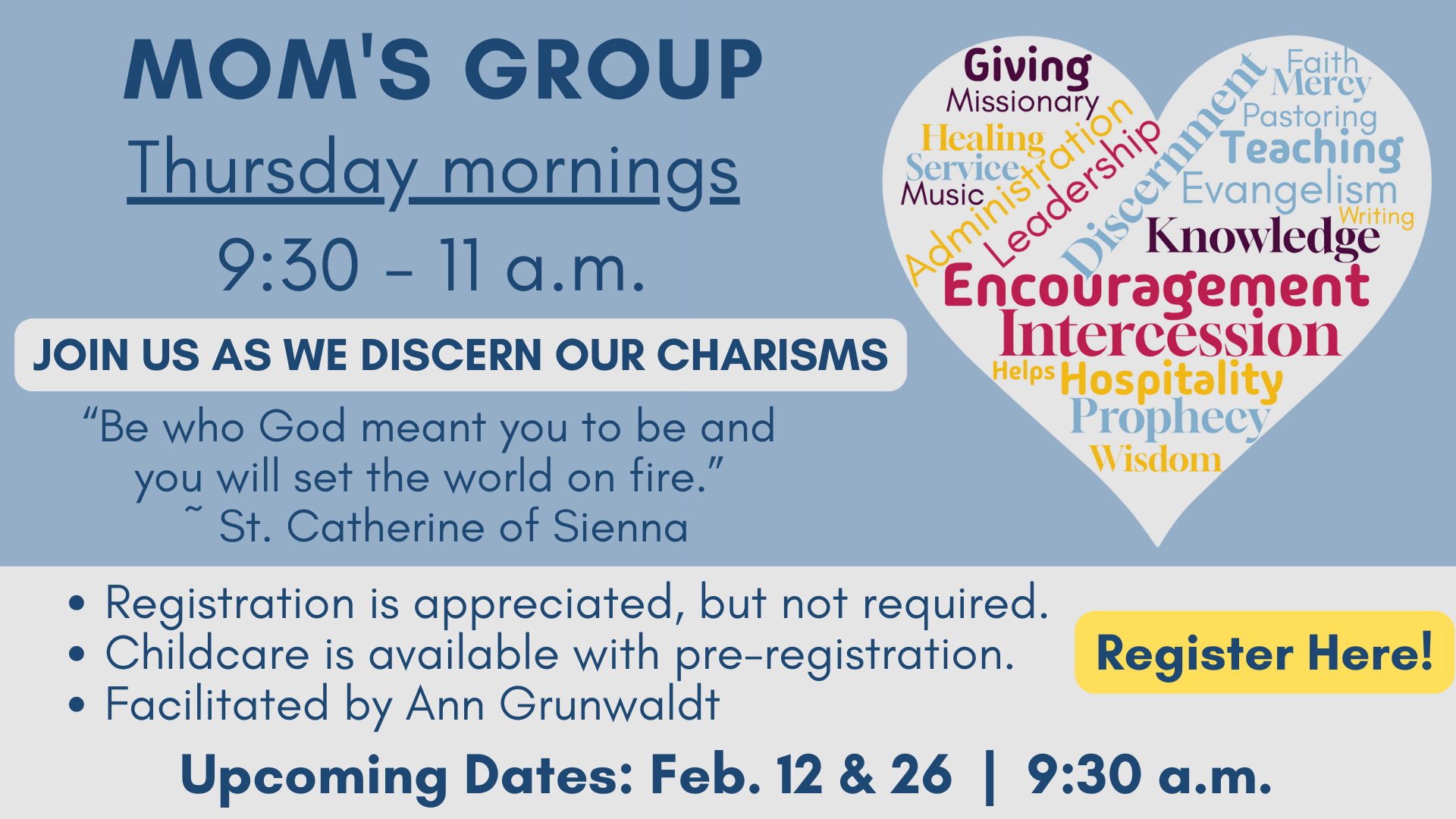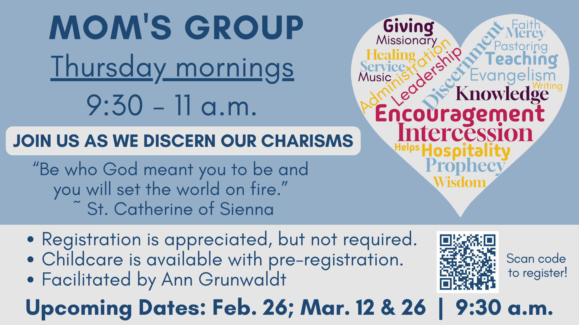 Mom's Group is a time for moms to come together for community building, faith sharing, and hospitality. Meetings are facilitated by Ann Grunwaldt. Childcare is offered with preregistration.